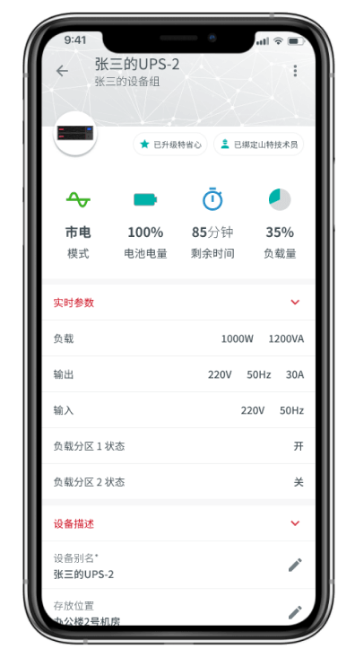 云智能電源管理App,集設備管理、數據監控、服務支持等功能。App 提供安全的通訊機制,使用非對稱加密機制確保數據傳輸及遠程訪問安全可靠。通過數字化技術幫助客戶不受地域和時間限制,便利地查看及管理接入山特云平臺的UPS,即時獲得事件及故障報警提醒。App為客戶關鍵業務持續運轉,時刻在線保駕護航。